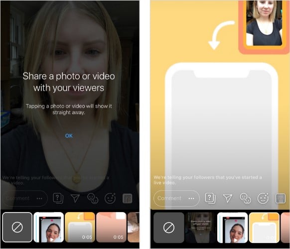 Lorsque vous ajoutez une image ou une vidéo à partir de votre pellicule, votre flux vidéo en direct se déplace dans le coin supérieur droit de l’écran de diffusion, au-dessus du support que vous avez choisi de partager. C’est l’occasion d’être particulièrement créatif et de concevoir en amont plusieurs images et vidéos – grâce à notre liste d’outils gratuits et faciles – pour créer un effet de «diaporama». Il vous suffira d’appuyer sur l’image ou la vidéo suivante que vous souhaitez partager à partir du panneau en bas de l’écran.